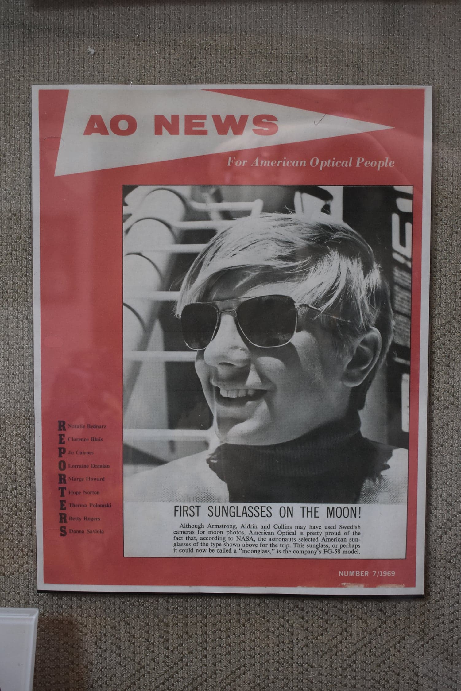 The entire Apollo 11 crew was outfitted with these kits, their sunglasses safely stored in a specially designed space case. When Neil Armstrong and Buzz Aldrin became the first men to walk on the moon, the AO FG-58 became the first pair of sunglasses on the moon. You can see the sunglasses astronaut Michael Collins carried on display at the Smithsonian Air and Space Museum.